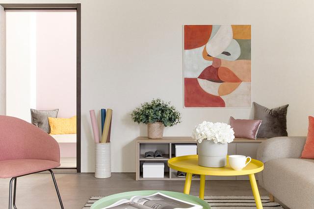 一件現代藝術作品將不同的色調融合在白色的客廳墻上,而茶幾,采用鮮艷的黃色與綠色搭配,條紋狀的地毯使空間顯得更寬。各種鮮艷的色彩搭配,讓空間充滿了春天的活力。然而,不知道大家發現沒,大部分的墻壁和較大的家具件都是中性的風格。主要就是較小的配件和特色部分,創造了整個房間的亮點。