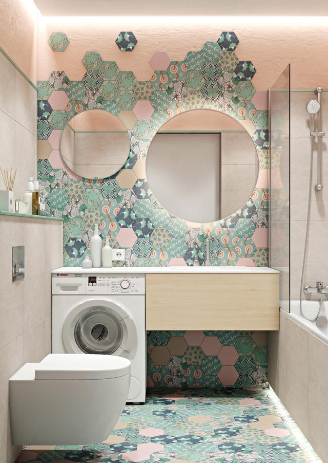 綠松石和橙色六角形瓷磚構成了浴室雜物間內的奇觀。一個極簡抽象派的漂浮梳妝臺和洗衣機后面的墻上是復雜的圖案。與土工切割的瓷磚、圓形梳妝鏡和裝飾性墻壁鏡子形成了曲線美的對比。浴缸后面的瓷磚保持簡單和中性。
