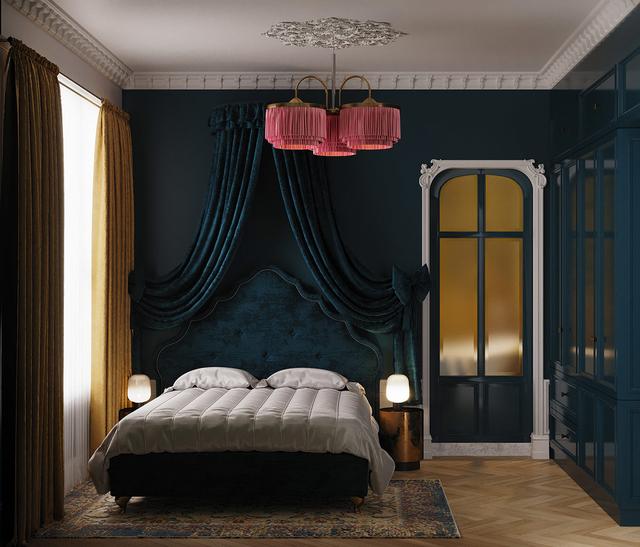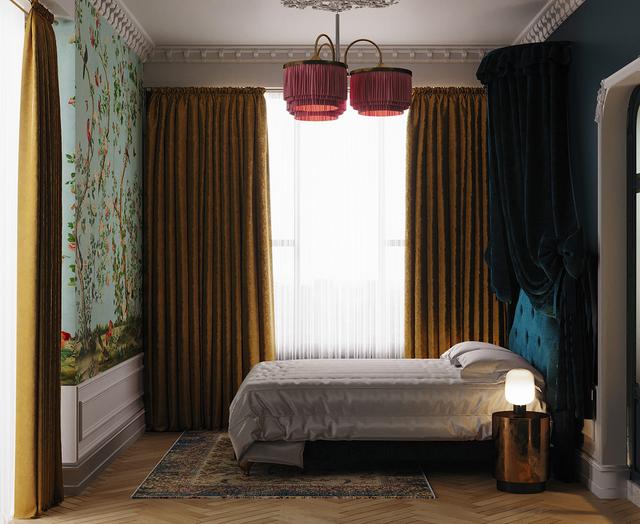 傳統天幕窗簾上方匹配青色天鵝絨床頭板。旁邊是黃色的不透光的窗簾,與臥室門的黃色毛玻璃相呼應。粉紅色的吊燈猶如點睛之筆,使花卉墻紙上更突出粉紅色的細節。不僅不會突兀,反而顯得更加溫馨舒適。
