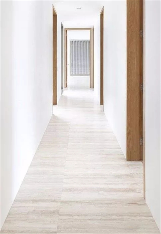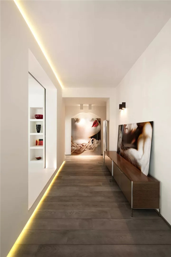 如果戶型里有采光不夠的走廊,就可以貼著墻部底面做個(gè)燈帶, 讓它成為一條亮起來的踢腳線,既補(bǔ)足了亮度,又好看。
