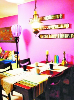 ??? 雖說客廳在平時是接待客人的公共空間,但在情人節(jié)這天也免不了成為情侶們促膝談心的主場。這個地方自然少不了浪漫氣息的包圍。你可以用粉色、紅色的布藝窗簾、靠枕和花瓶等裝飾品為客廳打下主色調(diào),再從中選取一些造型或設(shè)計有特殊含義的飾品放在最顯眼處,比如心形抱枕、帶有I LOVE YOU字樣的玻璃花瓶、印著彼此都喜歡的玩偶圖案的地毯,甚至多種顏色的氣球也是不錯的裝飾品。當(dāng)然,客廳茶幾上的玫瑰花是少不了的,是99朵還是999朵就看你的誠意了。