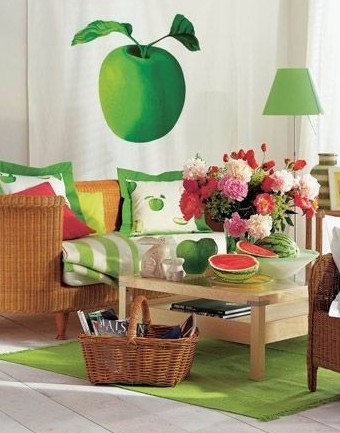 ??? 客廳靠近陽臺的位置開辟一處休閑區,藤編座椅和沙發椅和綠色靠包、地毯和燈飾,清新養眼的休閑區就打造成功了,摒棄傳統的收納工具,一款藤編收納籃在這里顯得異常醒目。