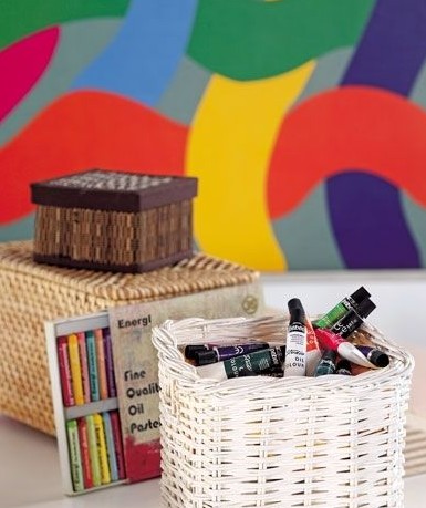 ??? 愛畫畫的人水彩筆、蠟筆、油畫顏料、水粉顏料,這么多的東東來一個不怕染色,不怕水洗的藤編收納筐是最好不過的了。