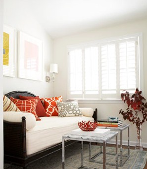 ??? 4、給人熱情感覺的紅色靠包與白色背景對比搭配,增添了空間里的暖意。