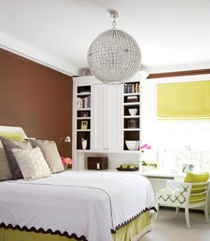 ??? 在白色家具和白色床品的基礎上,棕色的墻面為空間增添了穩重感。棕色的暖與綠白色的冷,就像咖啡遇見白茶,各有各的優雅氣質。