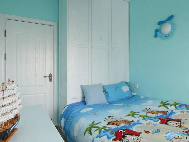 次臥的裝修裝成了榻榻米的臥室,這種榻榻米臥室的格局設計很到位,畢竟空間實在是小,所以沒有辦法打造成榻榻米,確實節(jié)省了很多的空間,把兒童房裝的比較溫馨,墻壁用的是天藍色搭配白色的衣柜和床鋪,色彩十分的小清新。