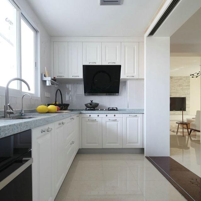 開放式的廚房裝修,打造的是一個轉角設計的櫥柜,這樣的白色大櫥柜搭配高級灰的臺面,把廚房裝的十分的上檔次,面對開放式的格局設計,只是做了一個門框,這樣的廚房以后烹飪會顯得更方便舒適。