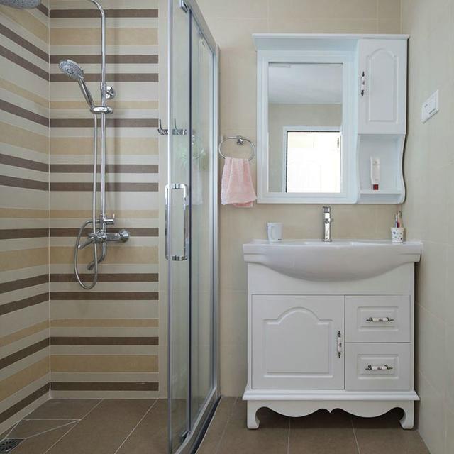 衛(wèi)生間空間不大做的也是干濕分離,打造一個獨立的淋浴房,安裝的是玻璃材質的弧形淋浴門,對于這樣的格局設計方式,體現了比較美觀大氣的一面,這邊靠著墻角的地方安裝的是白色的小型浴柜,基礎的配套設施也很完善。