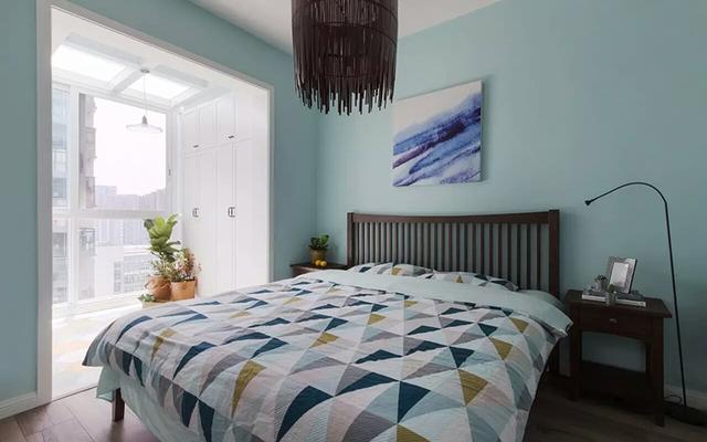 臥室裝修與陽臺打通,陽臺采用打柜的設計,可以靠墻打造到頂的白色柜子,這樣柜子的設計不占用空間,同時雙開門的柜子也能實現大容量收納。不影響陽臺的空間感,柜子用于陽臺設計也能滿足臥室物品的收納。
