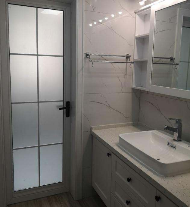 衛生間選用了臺中盆,木工做的浴室柜,里面藏了小廚寶,上面做了鏡柜。