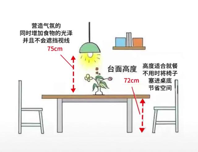 餐廳吊燈在餐桌面上方75cm左右,臺面距離地面72cm左右是比較科學的尺寸。