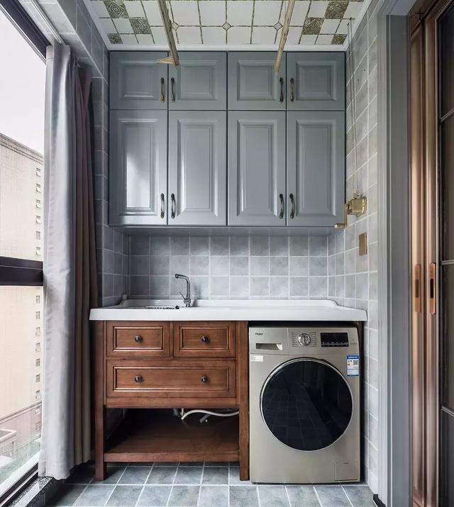 1萬多1㎡的陽臺,只拿來洗衣晾曬,那就太心痛了??梢栽谙匆鹿裆线叴虻豕?,或者直接做整面墻柜子,不常用的東西如行李箱,可以放在這里,為家里騰出活動空間。