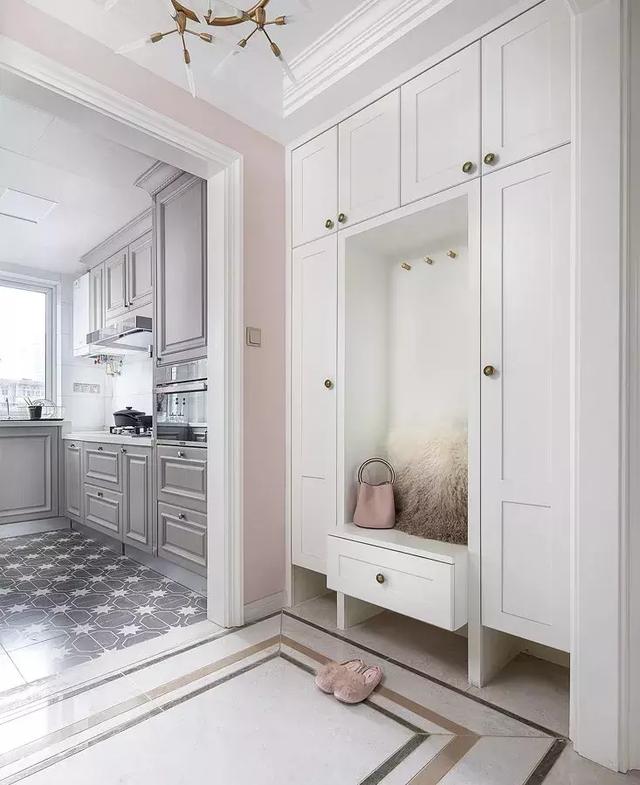 玄關柜做得好,基本上家里一半的東西都收納進去了,建議大家做成嵌入式及頂天立地式的,這樣子不占用建筑面積,還不用擔心頂部積灰。