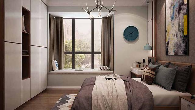 臥室的裝修也是充滿了抽象色彩,墻壁裝飾用的就是抽象壁畫,床尾墻壁打造的到頂的衣柜,與飄窗完美的結合,這樣的整體性臥室裝修,給人一種很富有品位的感覺,同時也裝的十分的時尚休閑,看起來格調感滿滿。