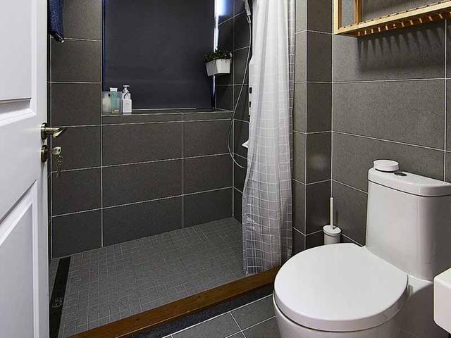 衛生間做了干濕分離,但是由于空間的局限性,安裝的是窗簾進行了隔斷,只不過衛生間的地面采用的是下沉式的干濕分離,墻壁和地面鋪的是深顏色的高級灰色地磚,搭配白色的美縫劑看起來很是顯大氣。