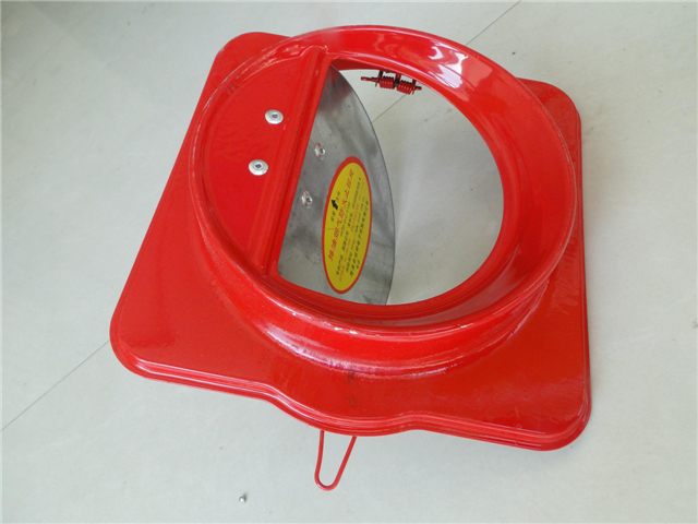 2、在其閥體進風(fēng)口處裝有一塊擋油網(wǎng),網(wǎng)下有一接油盒,擋油網(wǎng)與閥體進風(fēng)口以活動抽形式連接;擋油網(wǎng)之后的止逆閥腔體內(nèi)裝有一整板式風(fēng)門;進風(fēng)口管體套裝在止逆閥腔體內(nèi);風(fēng)門通過固定在進風(fēng)口管壁上的偏心軸裝于管體上,可繞此軸開啟和關(guān)閉止逆閥出風(fēng)口。