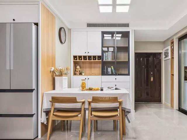 客廳與餐廳之間采用了開放式的設(shè)計(jì),這樣使得空間顯得更加敞亮,精致的餐桌上還鋪上了格格圖案的桌布,感覺非常溫馨有家的感覺,餐廳柜采用到頂?shù)脑O(shè)計(jì),將空間很好的使用了起來,豐富的儲(chǔ)物空間能夠收納不少物品,使得餐廳顯得更加整齊大方。