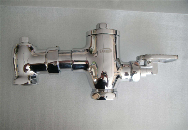 閥門的整體是由四大部件組成:1檢修閥;2聯(lián)接管;3沖洗閥(主體);4沖洗口。檢修閥有一個水開關(guān)調(diào)節(jié)螺絲,以便于維修,沖洗閥體上有一個增壓水腔和延時時間調(diào)整螺絲。閥體內(nèi)有一個上下活動的閥芯,閥芯有鑄銅和塑料兩種材料,它由卸壓桿、進水口、增壓針孔、上下密封橡膠圈組成。在平時狀態(tài),下膠圈與閥體水腔內(nèi)的水壓加閥芯重力共同作用使下膠圈與出水口密封阻斷水路,人踩腳踏板后閥芯卸壓桿偏離軸心3~5度的傾斜角,沖洗口與閥體水腔連通,此時,就在閥體水腔上部的靜壓力被釋放的剎那間,腔內(nèi)壓力與大氣壓相等,管道內(nèi)水壓力推動閥芯上移,管道水與出水口相通,形成較大水流,完成沖水動作。在沖水的同時,閥芯上移,閥芯上膠圈與上水腔密封,管道水通過閥芯進水口過濾網(wǎng)后的1毫米加壓進水針孔向增壓水腔供水,隨著上水腔內(nèi)水壓的增加,迫使閥芯下移,閥芯下膠圈封住出水口,達到延時的目的。