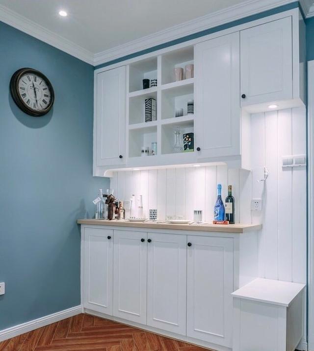 白色的玄關柜搭配藍色的墻面,干凈又清新,中間做挖空設計,擺放了酒瓶和餐具,內藏筒燈更顯明亮干凈,封閉和開放式柜體結合,既能儲物又能作為展示。