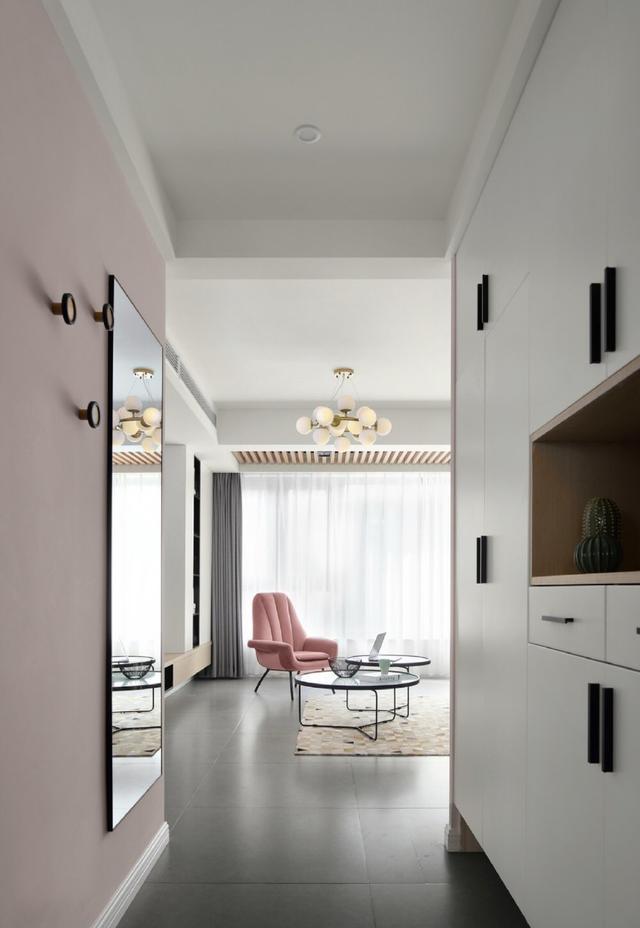 走廊式的玄關由于面積比較窄,不適合擺放太多東西,不然會顯雜亂,左邊墻壁上掛了一面全身鏡,方便整理形象,增加居室通透感,紐扣式的掛鉤便于掛包包和衣服,右邊做了嵌入式柜子,中間留空可以存放一些出門常忘的東西,一眼就能看到。
