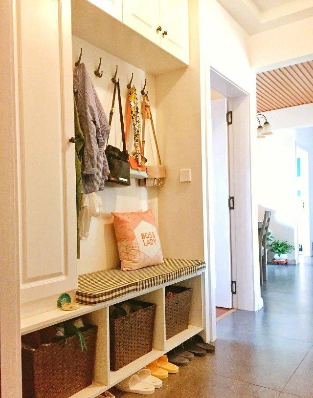 把柜子嵌入墻體,不占面積,節省空間,底部兩層開放隔板設計,放置居家拖鞋和經常出門穿的鞋子非常合適。頂部的吊燈散發出柔和的光線,讓人一進門就倍感溫馨。