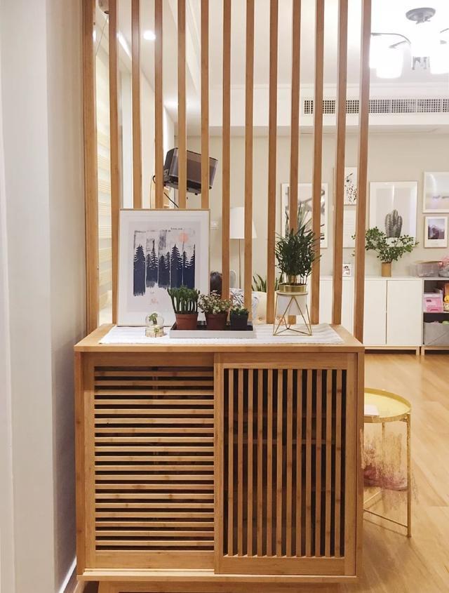 用木質隔斷作為玄關柜,散發出自然柔美的味道,家居顏值提升的不止一點點,鏤空的柜門便于鞋子通風,柜臺上擺放了畫框和綠植,起到展示作用。