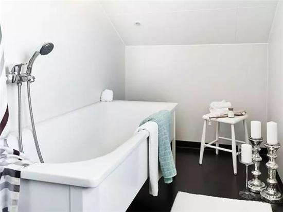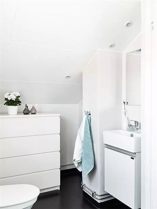 兼具泡澡和淋浴的小閣樓上的衛生間,純白色設計很是干凈,加上精美燈飾和花朵裝飾,讓衛浴間充滿了生機,讓你在在沐浴時愜意而舒心。