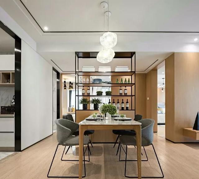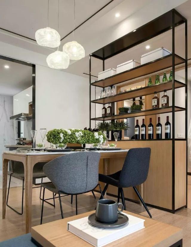 餐桌旁的博物架,被當做了餐邊柜以及酒架,更開放式的設計,把餐廳的洋氣情調顯露得一覽無余。