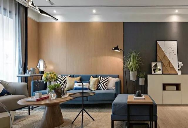 客廳用色簡單,主要以木色和深藍色為主,體現(xiàn)出質感。沙發(fā)背景墻為木材裝飾,溫潤質樸的感覺在燈光襯托下,顯得尤為溫馨素雅。