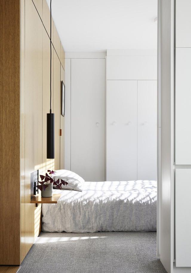 臥室是一個獨立的區(qū)域,但仍然看起來與社交區(qū)相連,在這種情況下,主要目標是通過使用大量的功能分層和重疊,以及簡單的材料調(diào)色板和輕松的顏色和飾面,使小公寓感覺比實際大。為小空間尋找合適的家具可能是一個真正的挑戰(zhàn)所以解決方案是用木頭建造一個大型的落地式墻壁單元,有點像在入口通道和浴室之間延伸的木箱,并提供充足的存儲空間。