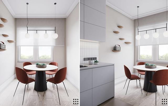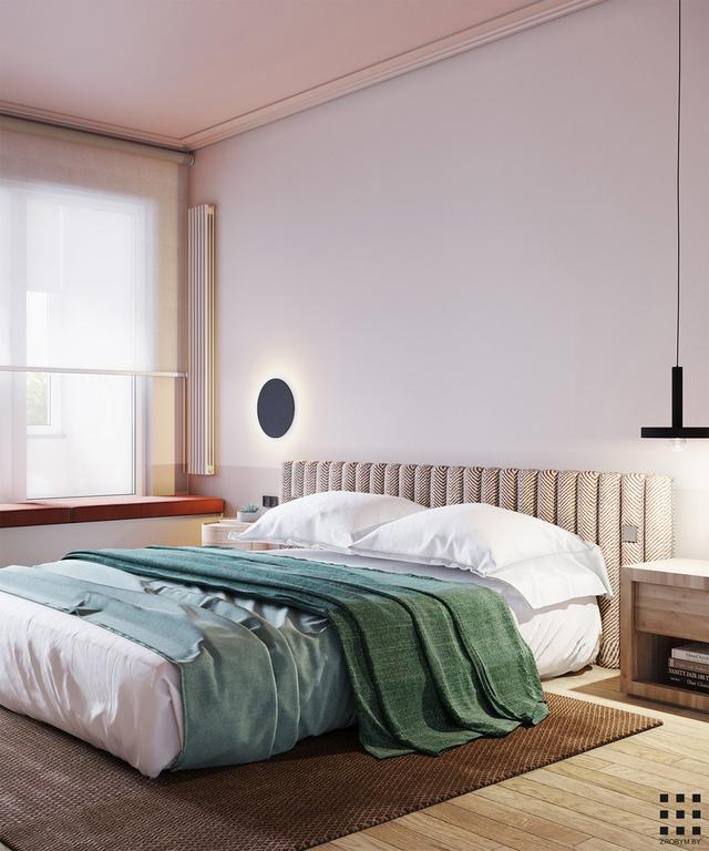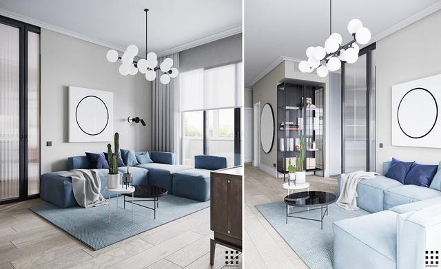由Zrobym建筑事務所設計和視覺化的白俄羅斯明斯克Zakharova的這套94.6平方米的公寓裝修設計采用了柔和的藍色、藍綠色和青銅色調。色調,從光譜的每一邊走到一起,形成一個歡迎的溫暖調色板與和平的質量。有一個循環的主題貫穿整個家庭內部。墻壁藝術和嵌套的咖啡桌有一種圓形美學,還有大型圓形墻壁鏡子、圓形吊燈、嵌入式天花板燈、半圓形壁架和曲線形餐椅。滑動玻璃門使小房間感覺開放和通風,隱藏的存儲體保持整潔。