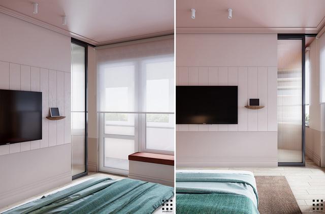 臥室電視墻上覆蓋著白色面板。一個半圓形的壁架,與廚房里使用的壁架相匹配,安裝在電視機上,上面放著一個電子平板電腦。