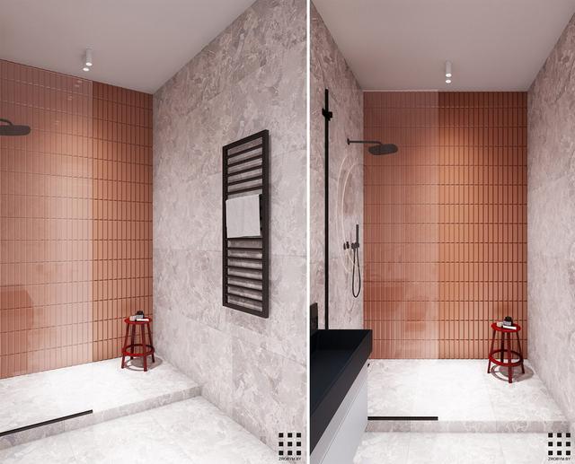 套間主浴室的淋浴墻上貼著銅色瓷磚,一個紅色的小凳子把洗漱用品放在手邊。黑色的加熱毛巾架、面盆和淋浴頭帶來了基調。