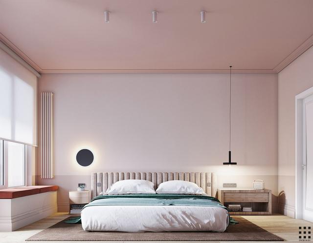 一個輕臥室方案包含一個人字形織物床頭板的地板床設計。床上裝飾著兩種色調的藍綠色,營造出層次感。一個圓形的黑色現代墻燭臺看起來像一個小邊桌上的月食,一個吊燈照亮另一個。查看更多關于臥室吊燈的想法。