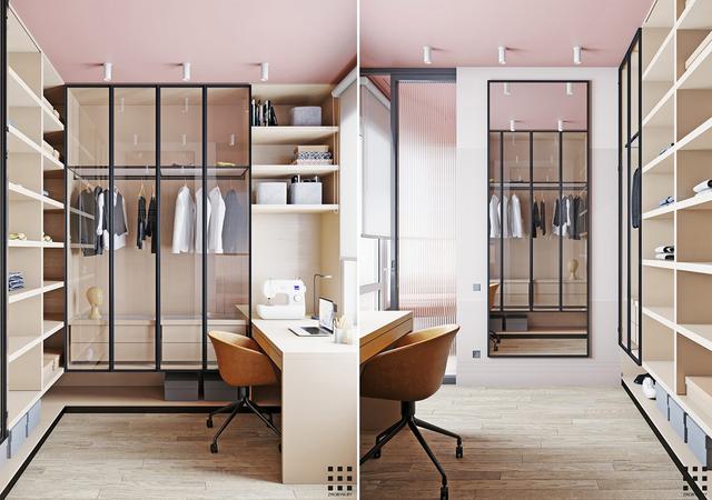 盡管房子很小,但有一個舒適的家庭辦公室和更衣室的組合連接到主臥室。縫紉機告訴我們,這是一個完美的設置,為業主參與時裝和服裝制作。玻璃柜的門保持整個系列的展覽,以激發靈感。配套的鞋盒擠在l型安裝底座周圍。桌子上方的架子上放著整整齊齊的辦公用品和成筐的縫紉用品。