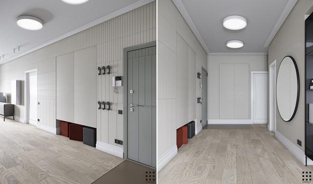 當休息室變成主走廊,在墻上有一個隱藏的存儲區域。三個立方體座位安置在簡單的平板前門下方的空隙中。一扇風雨交加的灰色大門在蒼白的墻壁上顯得格外醒目。圓形的燈與天花板平齊。在走廊的另一端,兩扇非常隱秘的門隱藏在墻壁中,隱藏了另一個儲物空間。