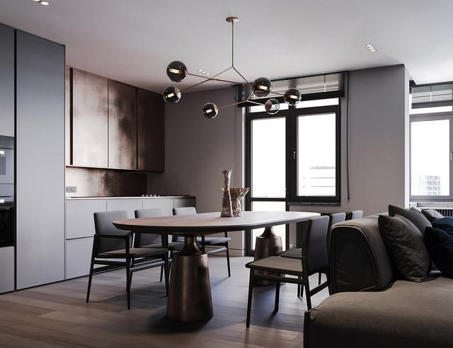 餐廳里有一種中世紀(jì)的現(xiàn)代氣息。一個(gè)很酷的人造衛(wèi)星枝形吊燈懸掛在一張橢圓桌子和六把智能椅子的上方。