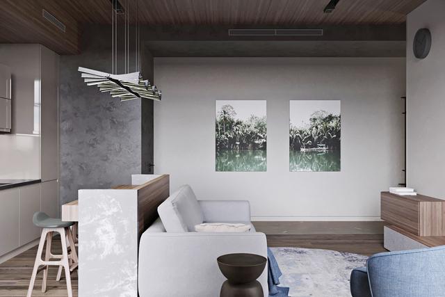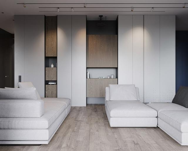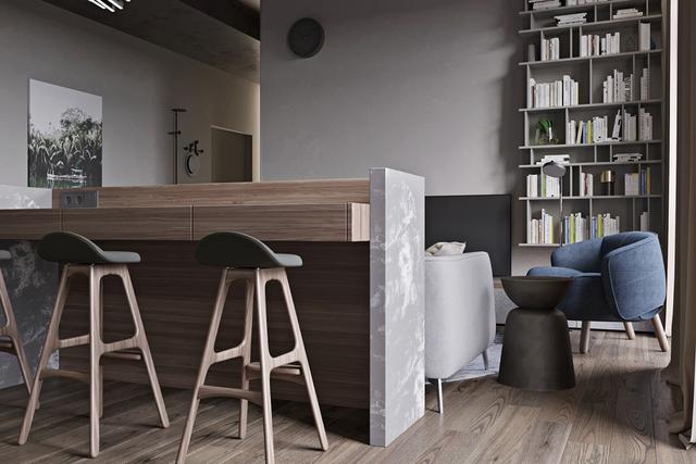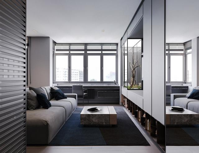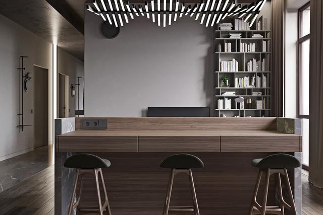 第三個(gè)室內(nèi)空間位于俄羅斯莫斯科的一套133.2平方米的公寓,是為一對(duì)年輕夫婦設(shè)計(jì)的。沙發(fā)被安排在開(kāi)放式布局內(nèi),定義了一個(gè)正方形的休息區(qū)。其中一張沙發(fā)后面放著一張小邊桌,方便把當(dāng)前的閱讀材料放在身邊。