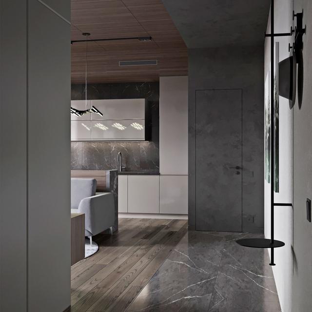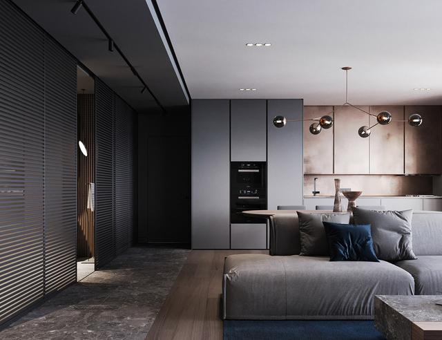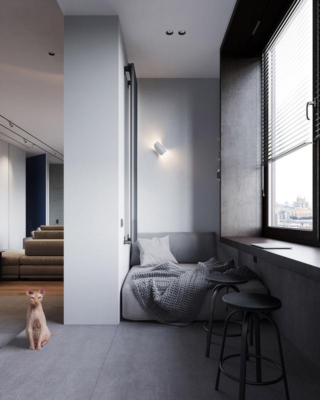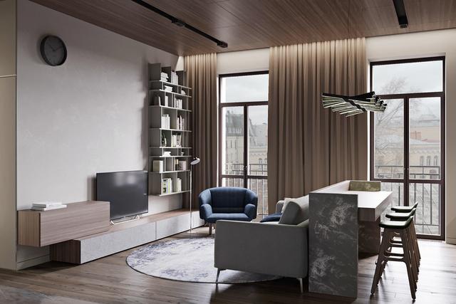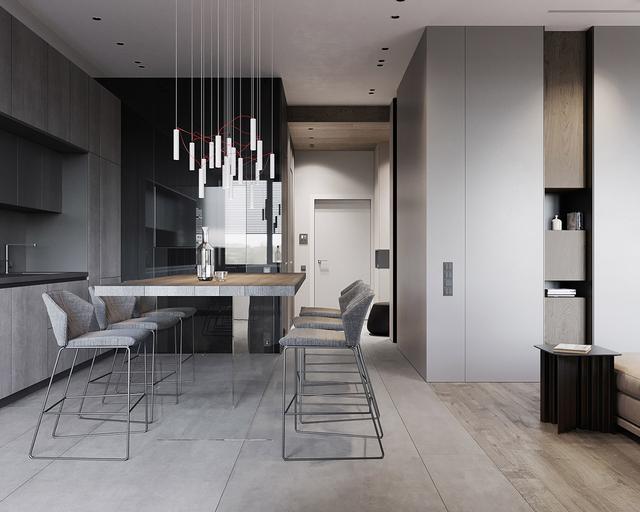 這是莫斯科市中心的一套公寓,一棟19世紀(jì)的歷史建筑,室內(nèi)面積只有54平方米。這所房子是為一個(gè)年輕的旅行商人設(shè)計(jì)的,他想要一個(gè)舒適的住宅,而不是住在酒店的房間里。一個(gè)現(xiàn)代化的沙發(fā)背靠廚房島。圓形的地毯定義了休息室的地板空間。