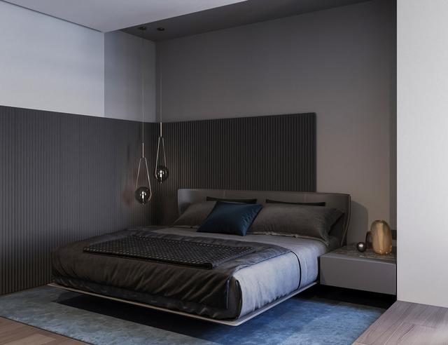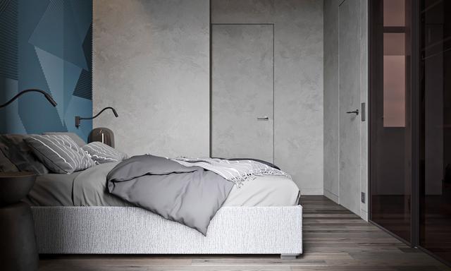 藍(lán)色臥室設(shè)計(jì)特點(diǎn)是有紋理的床頭墻。肋板被切割和連鎖在重音墻形成幾何圖案。