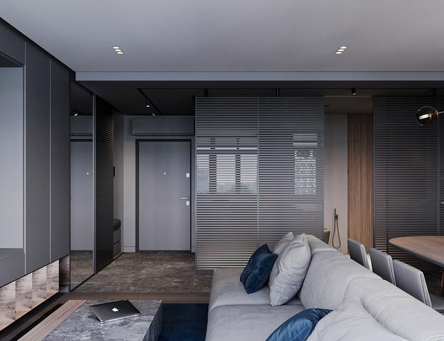 第二個(gè)房間比較寬敞。一張較長(zhǎng)的現(xiàn)代沙發(fā)將客廳與廚房餐廳分隔開(kāi)來(lái),但這一次中間有了呼吸空間。一個(gè)大的矩形藍(lán)色區(qū)域地毯包含休息室家具,包括一個(gè)現(xiàn)代咖啡桌在其中心。