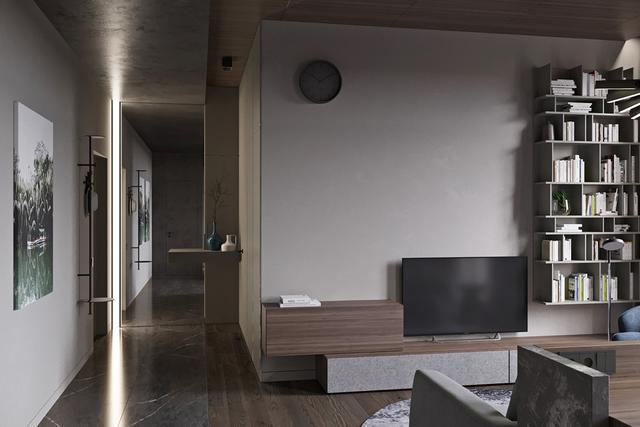 一個(gè)掛鐘安裝在媒體單元的上方,媒體單元從電視墻上走下來(lái)。壁掛式書(shū)架占據(jù)了另一端。