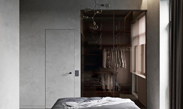 玻璃柜門(mén)與床腳相對(duì)立,通過(guò)彩色門(mén)擺放整齊的衣架。