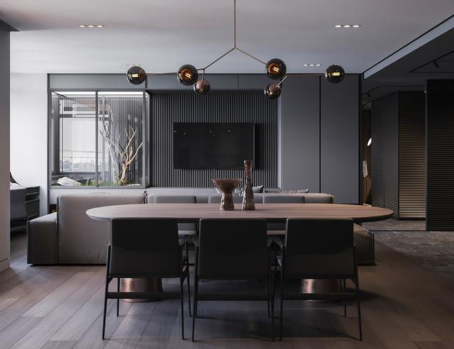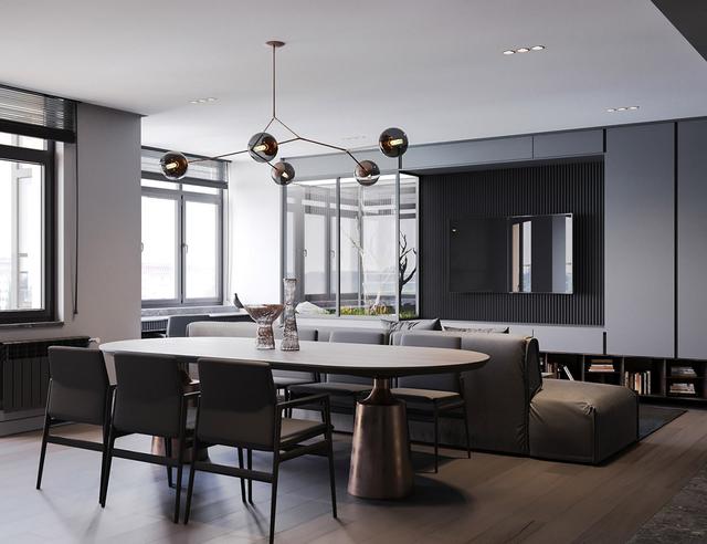 經(jīng)過(guò)休息室,我們進(jìn)入餐廳,當(dāng)代餐廳吊燈成為一個(gè)非常吸睛的裝飾。