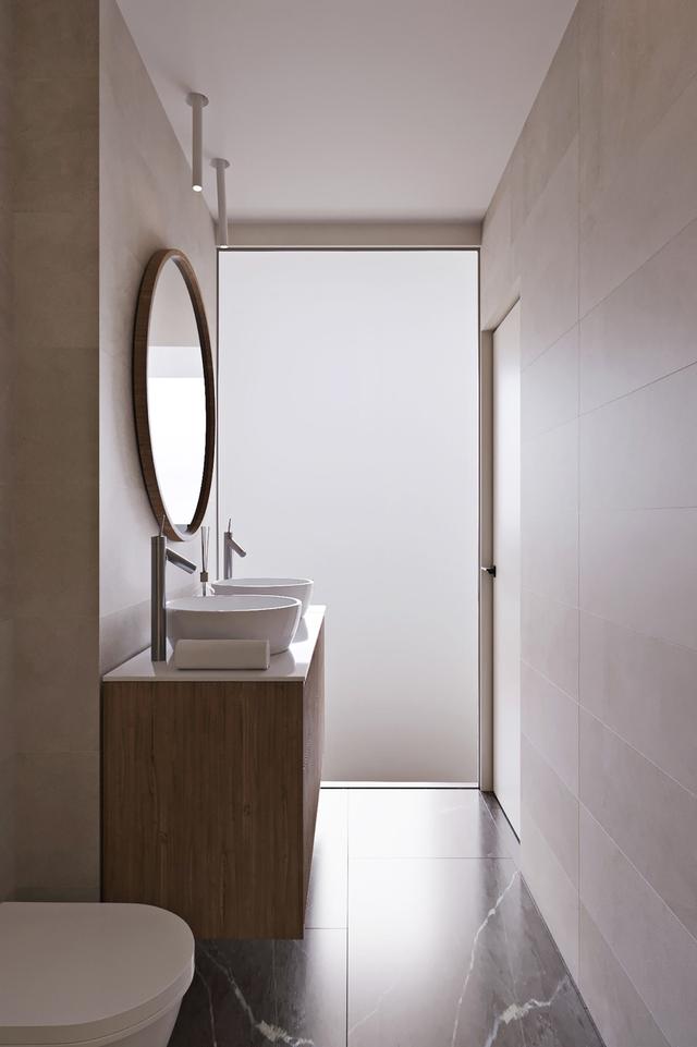 就在廚房旁邊,有一間玻璃墻浴室,里面有一個(gè)獨(dú)立的基座水槽和一面橢圓形梳妝鏡,與一面木板墻形成了美麗的搭配。