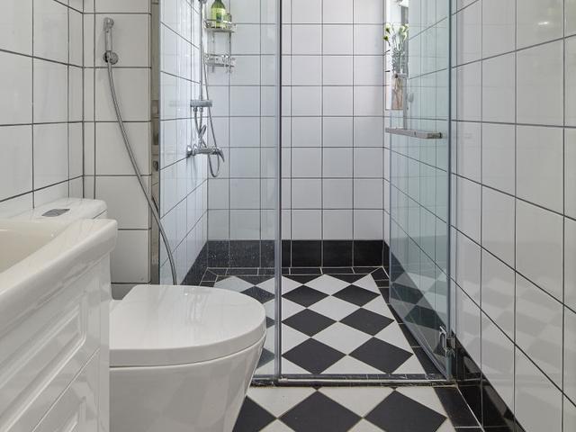 衛生間的空間不大,但是也照舊采用了干濕分離的設計方式,安裝的是一字格的玻璃門,墻壁與地面的磚運用的是白色與黑色的拼色搭配,呈現一種十分亮麗的格調,白色的其他基礎設施的安裝,緊湊安裝配套齊全。