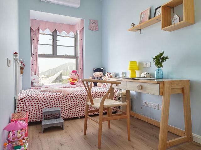 小臥室的空間做成了一個榻榻米兒童房,裝的也是充滿了小清新的格調,與主臥一樣用的是天藍色的墻壁,搭配原木色的一些家具,靠窗的地方打造的是 床鋪,雖然臥室的空間很小但是布置的很溫馨,適合小女孩居住。