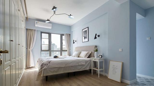 臥室裝修也是采用打通設計方式,實現隔斷式很有創意感,墻壁顏色運用的是天藍色,床尾的墻壁采用的是衣柜的設計,米白色的大衣柜占用了一面墻壁,好在是入墻式衣柜節省了臥室的空間,顯得臥室很敞亮。