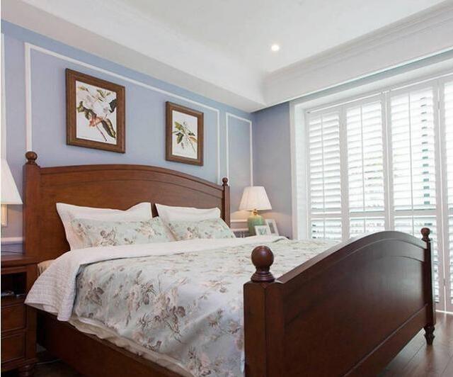 中間擺上一張棕色實(shí)木大床,和藍(lán)色墻面搭配頗有美式的風(fēng)范,顏值高,有質(zhì)感。
