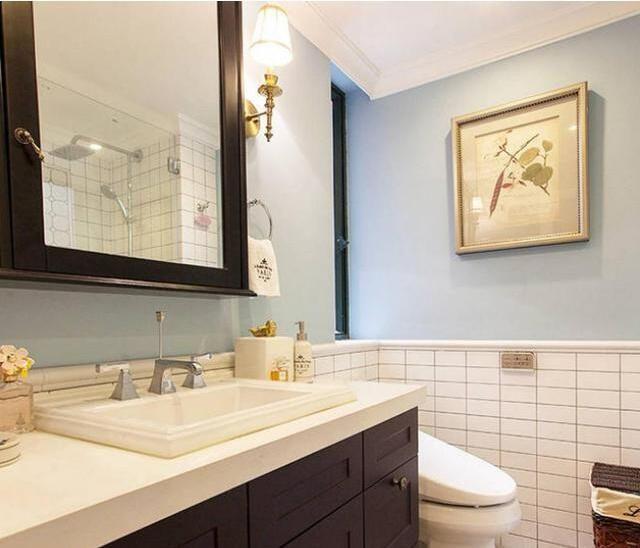 衛(wèi)生間,格局設(shè)計(jì)的不錯,洗手臺采用了黑白搭配的風(fēng)格,上方安裝鏡面柜,收納很豐富,墻面藍(lán)色墻漆與白色瓷磚的搭配,顯得干凈自然。